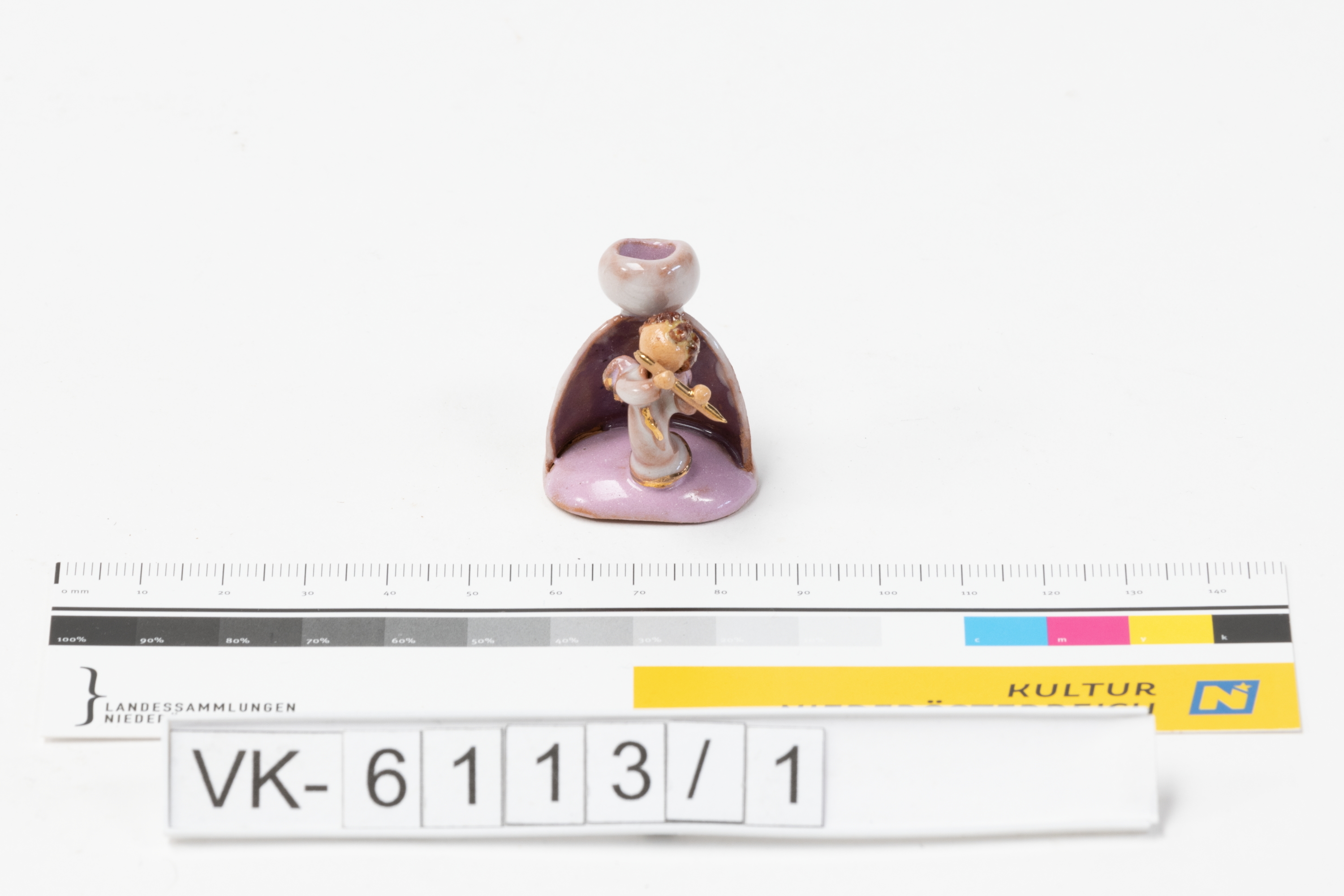 Kleine Keramikfigur mit mehrfärbiger Bemalung, goldenen Elementen und Glasur: Ein Flöte spielender Engel auf einem Sockel mit Rückwand, auf der ein kleiner Kerzenhalter angebracht ist.