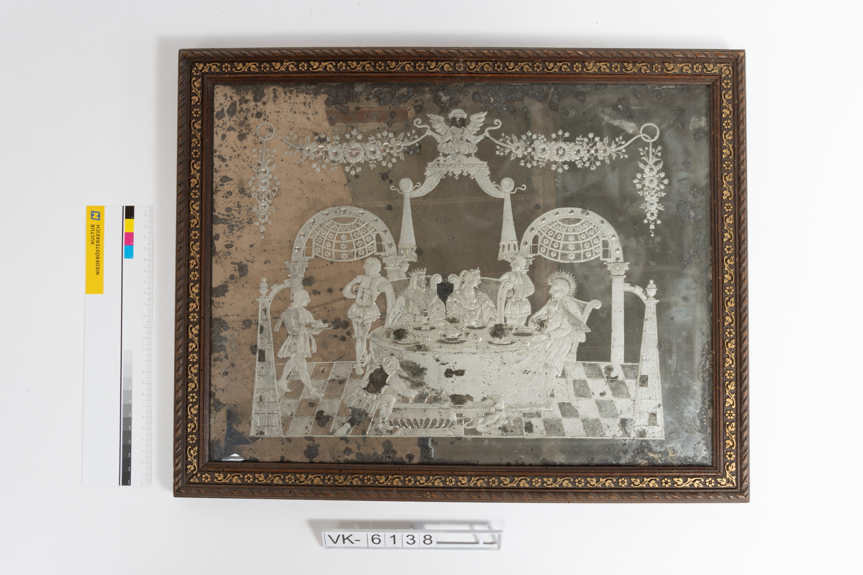 Spiegelbild mit der Darstellung des Hl. Nepomuk, an der Tafel sitzend mit König und Königin.