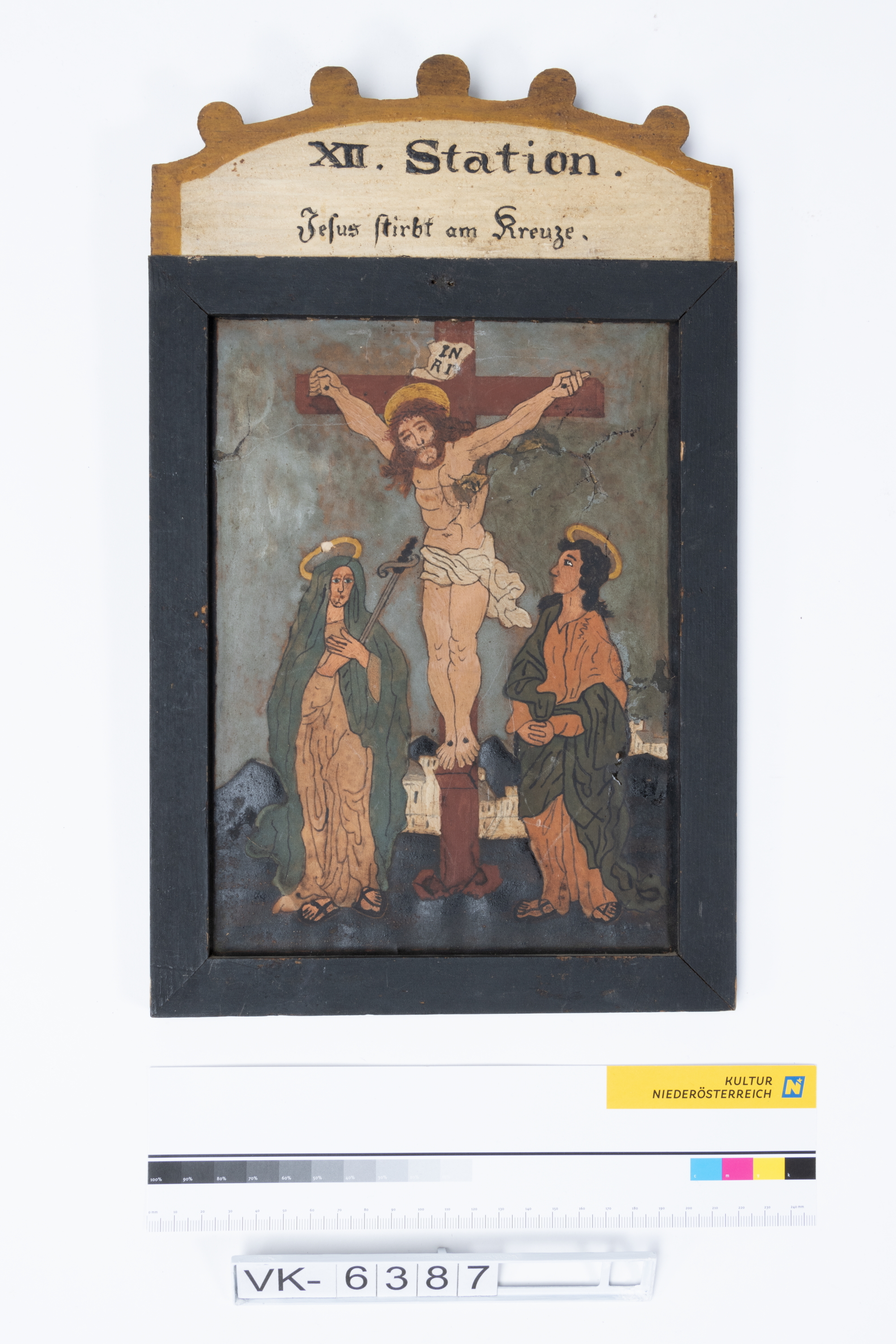 Kreuzwegstation: Auf Pergament gemaltes mehrfärbiges Bild (laut Inventarbuch vermutlich nach preußischem Vorbild) in einem schwarzen Holzrahmen mit Aufsatz und der Darstellung von Jesus am Kreuz. Auf dem Aufsatz befindet sich die Aufschrift: "XII. Station. Jesus stirbt am Kreuze."