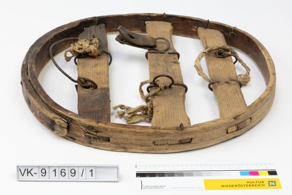 Schneeschuh aus einem oval gebogenen Holzelement, das drei Quersprossen aufweist; die Bindung wird von drei Drahtelementen gebildet, die zusätzlich Reste von Stoff- und Lederriemen tragen.