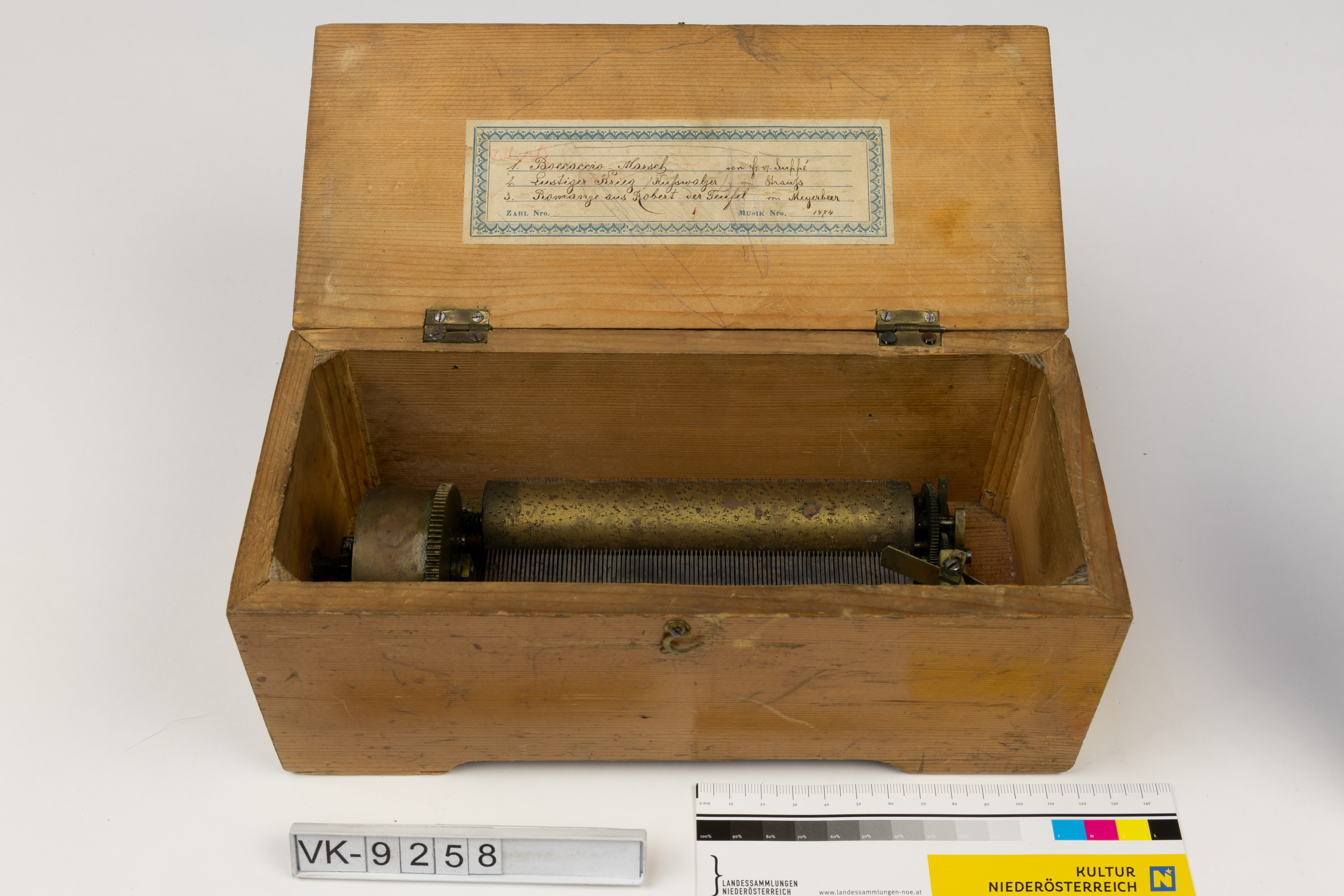 Walzenspieldose mit einem Holzkästchen mit Klappdeckel, darin die Walze mit Federwerk; die Kassette hat eine Öffnung für die Antriebswelle. Auf der Deckelinnenseite ist ein Aufkleber mit den Musikstücken, am Boden ein Werbeaufkleber mit Zeichnung eines Kaufhauses in Prag.