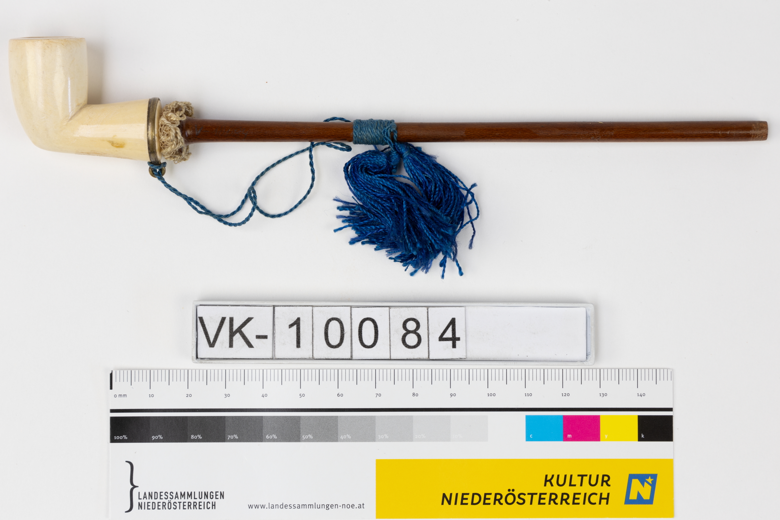 Kleine, aus Elfenbein geschnitzte, glattflächige Pfeife mit einem langen Holzrohr und einer blauen Quaste.