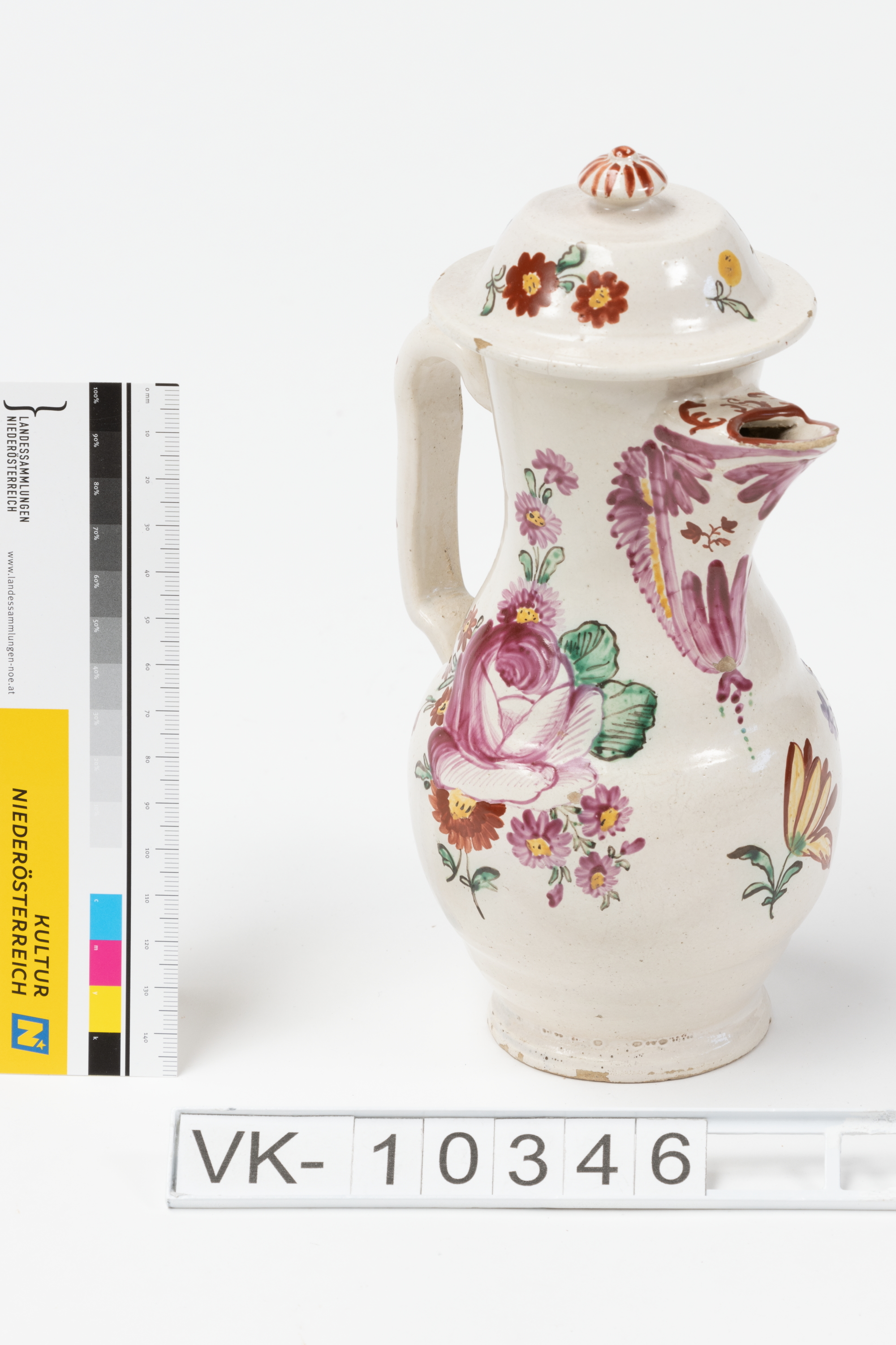 Bauchige Kaffeekanne (VK-10346a) mit einem Henkel und abgesetzter Fußzone. Die Kanne hat einen Deckel (VK-10346b) mit Knauf. Kanne und Deckel sind mehrfärbig mit Blütendarstellungen bemalt.