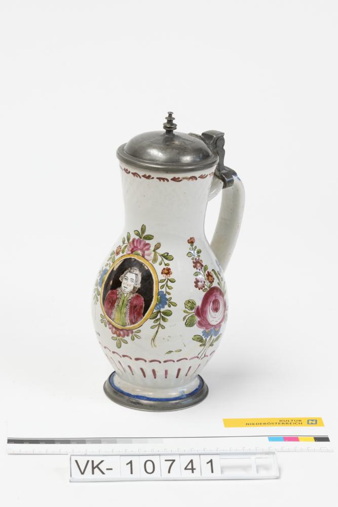 Bauchiger Krug mit einem unterrandständigen Henkel, an dem der klappbare Zinndeckel befestigt ist, einem Zinnring im Fußbereich und mehrfärbiger Bemalung: Große und kleine Blüten mit Blattwerk, ein Männerportrait in einem ovalen Rahmen.