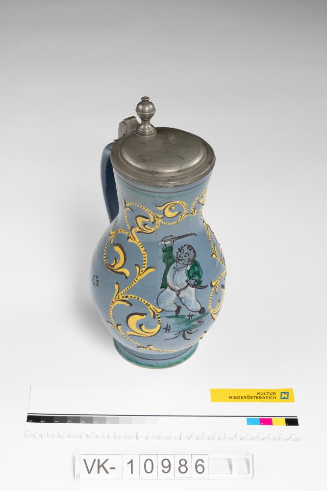 Leicht bauchiger Krug mit schulterständigem Henkel und einem daran befestigten Zinndeckel. Auf dem hellblau glasierten Majolika-Krug ist als Dekor ein gelber ornamentaler Rahmen angebracht, in dem eine Darstellung eines Türken gemalt ist, im Bereich des Henkels befindet sich die Aufschrift: "G P 1804".