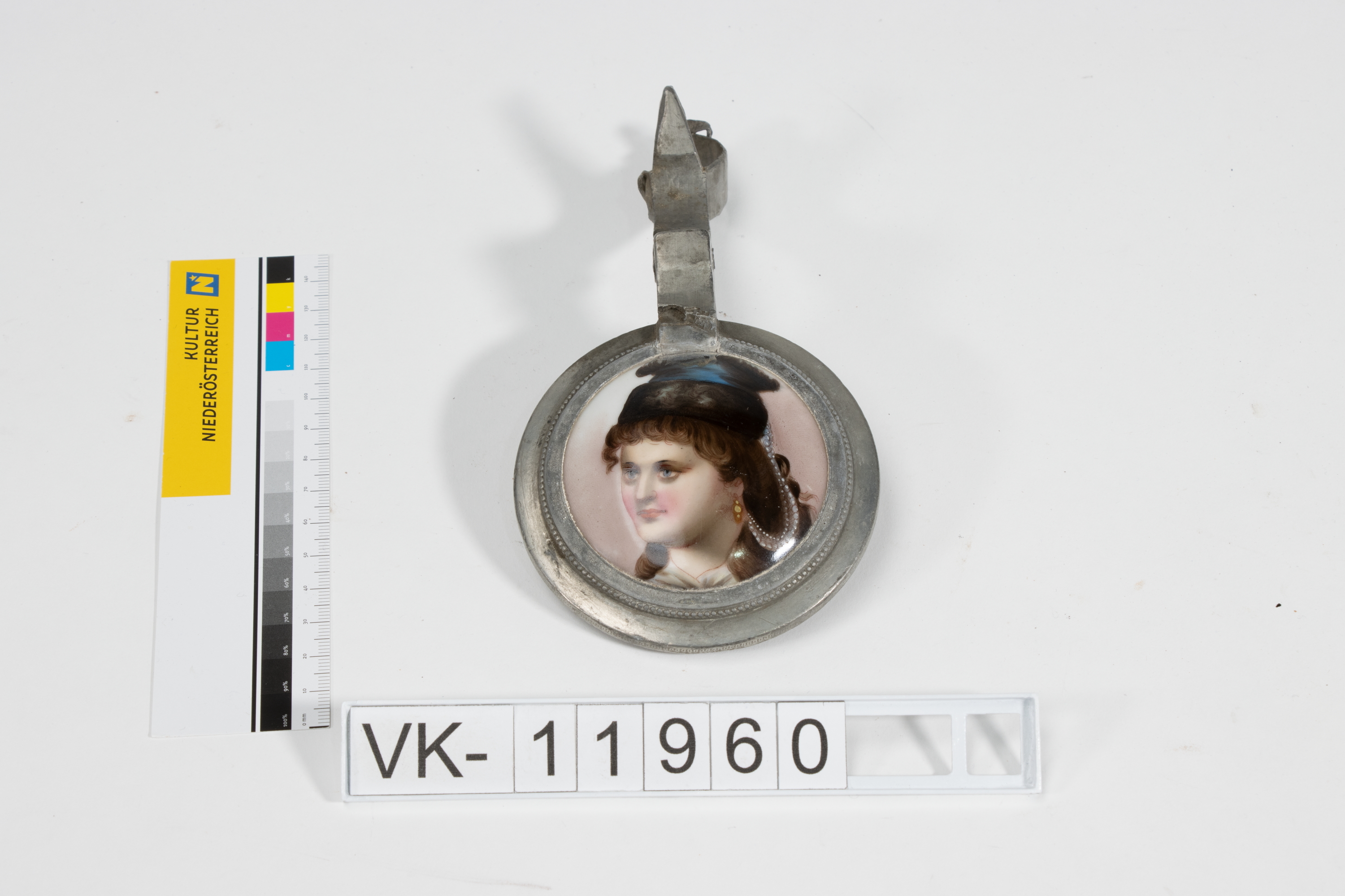 Zinndeckel für einen Krug mit Aufhängung und Gelenk und einem Einsatz aus bemaltem Porzellan mit der Darstellung eines Portraits einer Dame mit Hut.