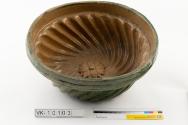 Mokkatasse mit gewellter Wandung und rotem gewelltem Rand; die Farbe der Wandung ist innen und außen von rosa zu weiß verlaufend, die Außenseite ist mit einem mehrfärbig gemalten Blütenmotiv mit Blattwerk verziert, der unterrandständige Henkel ist grün. Am Boden befindet sich eine Prägung: "FRAIN" und ein Aufkleber: "Robert Mayr sen. Znaim".