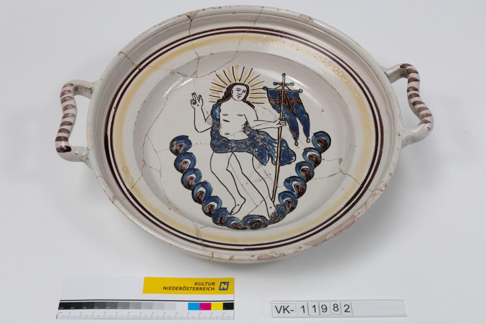Weiß glasierte Schüssel mit zwei randständigen Wulsthenkeln und einer Malerei auf dem Spiegel: Auferstandener Christus, zusätzlich umlaufende Linien auf der Fahne.