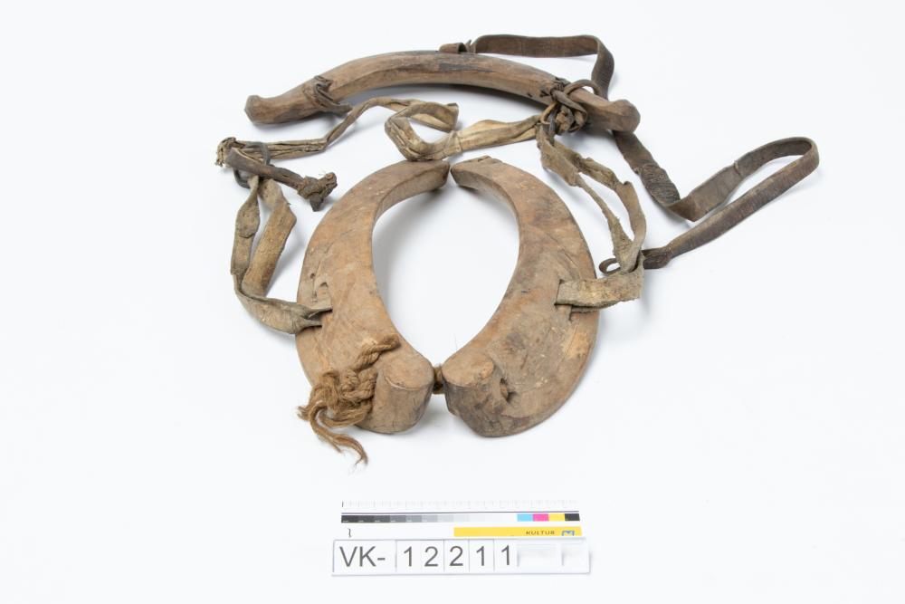 Hölzernes Zuggeschirr für Hals und Stirn, mit Lederriemen verbunden; das Zuggeschirr ist wegen seiner Größe für ein kleines Tier geeignet.