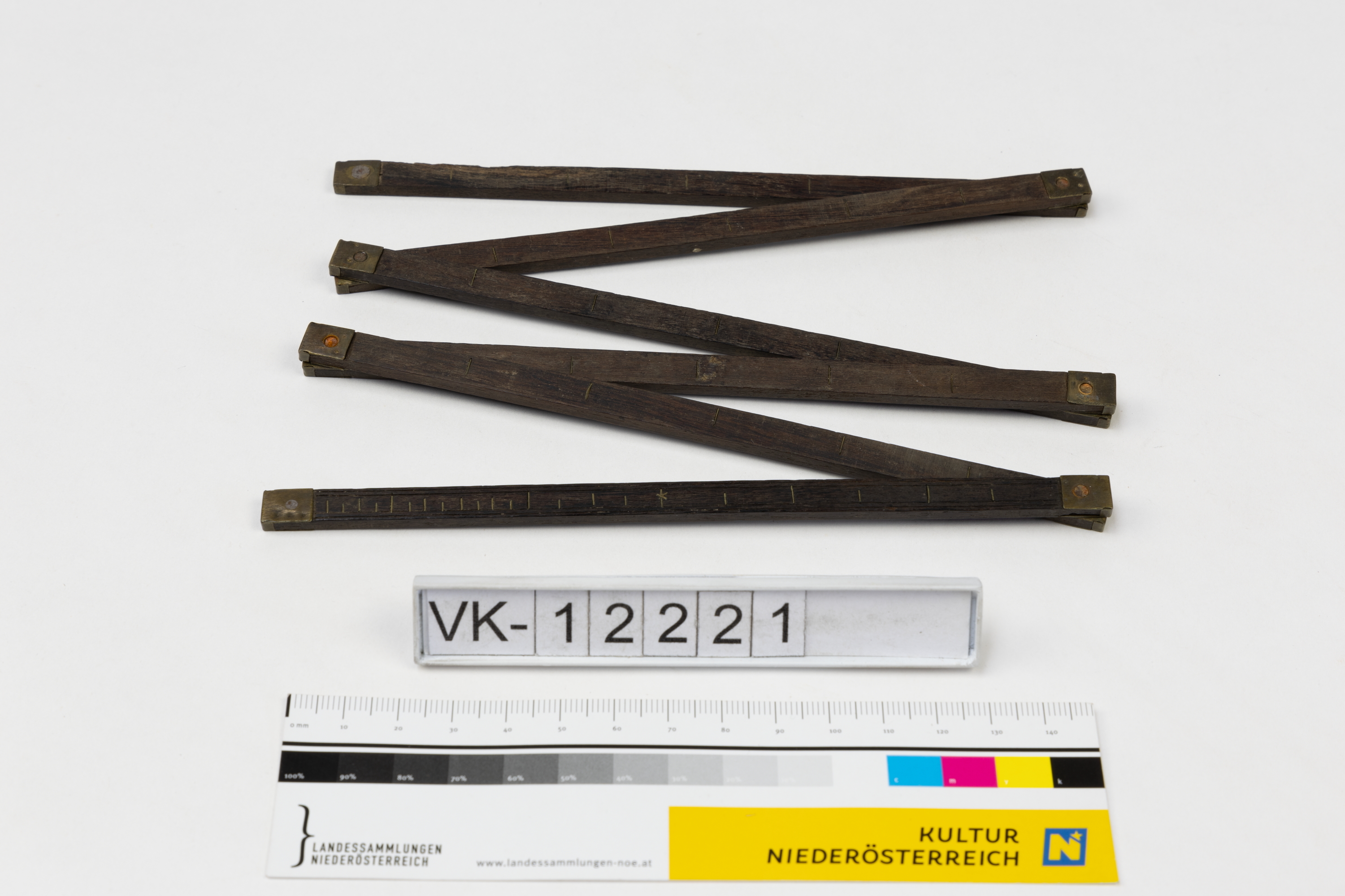 Zollstock aus sechs Holzelemten mit Metallverbindungen, die Einteilung ist mit Messingintarsien ausgeführt.