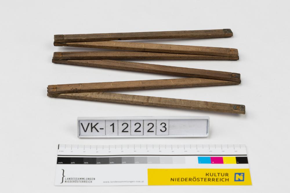 Zollstock aus sechs Holzelemten mit Metallverbindungen, die Einteilung ist mit Messingintarsien ausgeführt.
