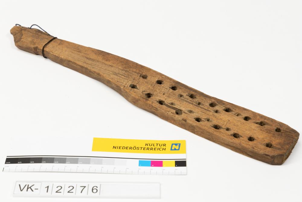 Annähernd rechteckiges Holzbrett mit zwei Reihen Löchern und einem Griffteil.