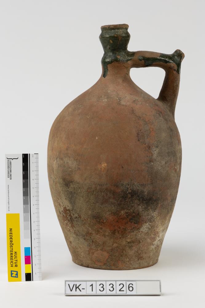 Plutzer aus gebranntem Ton mit dunkelgrüner Glasur in Hals und Henkelbereich.