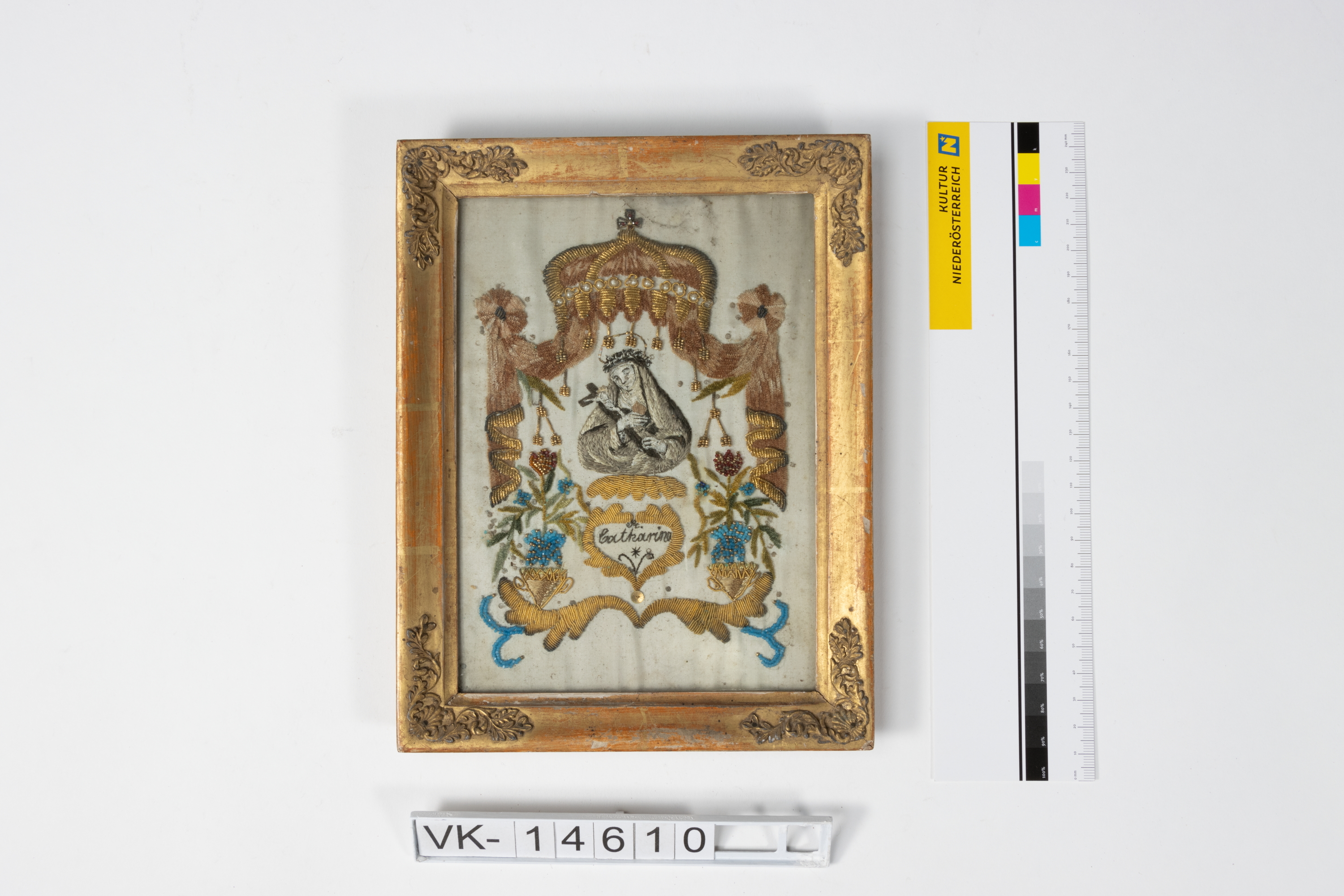 Stickerei hinter Glas in einem Holzrahmen: Darstellung der Hl. Katharina mit floralen und ornamentalen Dekorationen. Auf der Rückseite befindet sich ein Aufdruck: "J. STUPPERGER Neubau 213 Wien".