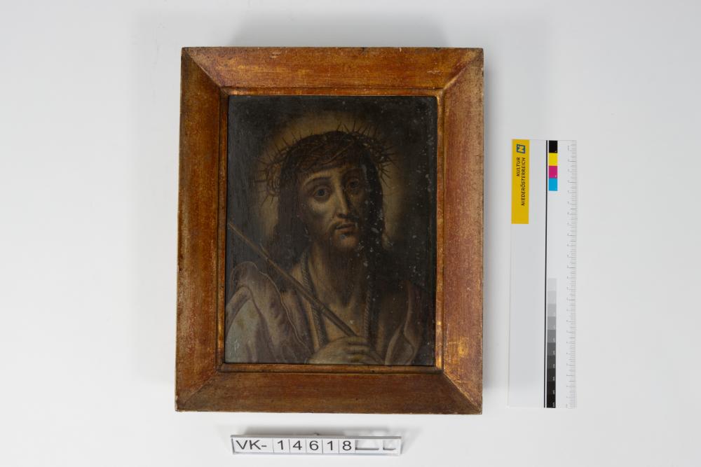 Malerei auf einer Blechplatte in einem rotbraunen Holzrahmen: Darstellung von Christus mit Dornenkrone.