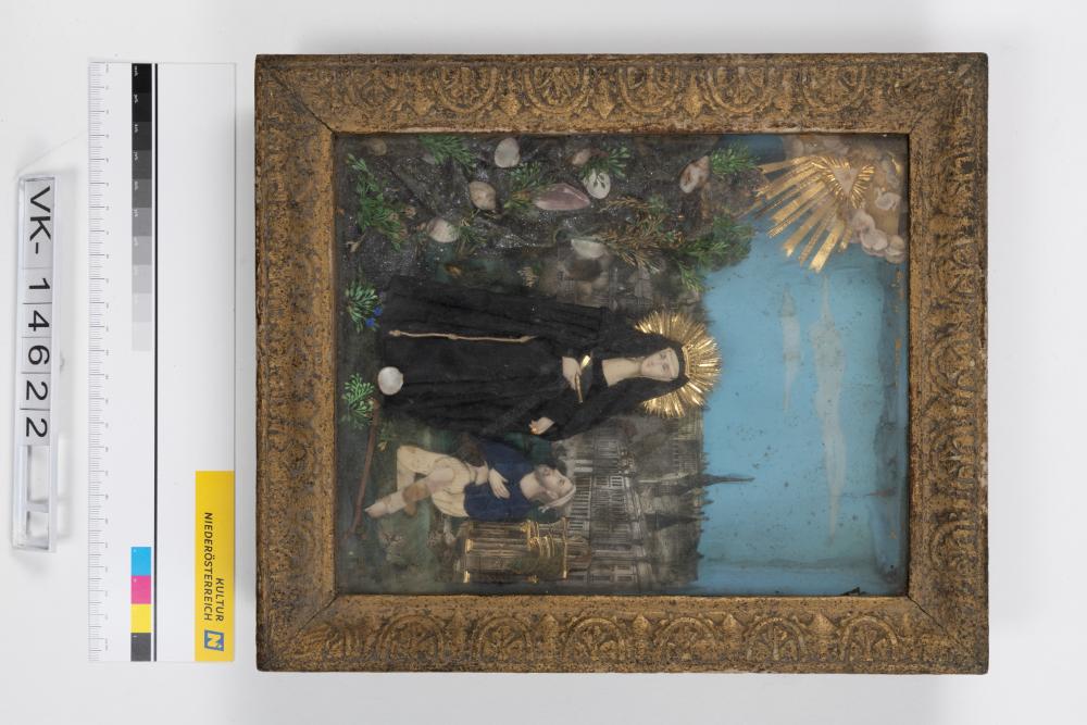 Kastenbild mit Papier verklebt hinter einer Glasplatte in einem Holzrahmen: Im Hintergrund eine Stadtansicht, davor eine Heilige, Almosen an einen Bettler verteilend (Figuren aus bedrucktem Papier, mit Stoff bekleidet), mit Goldfolie, Papierblumen und Muscheln verziert.