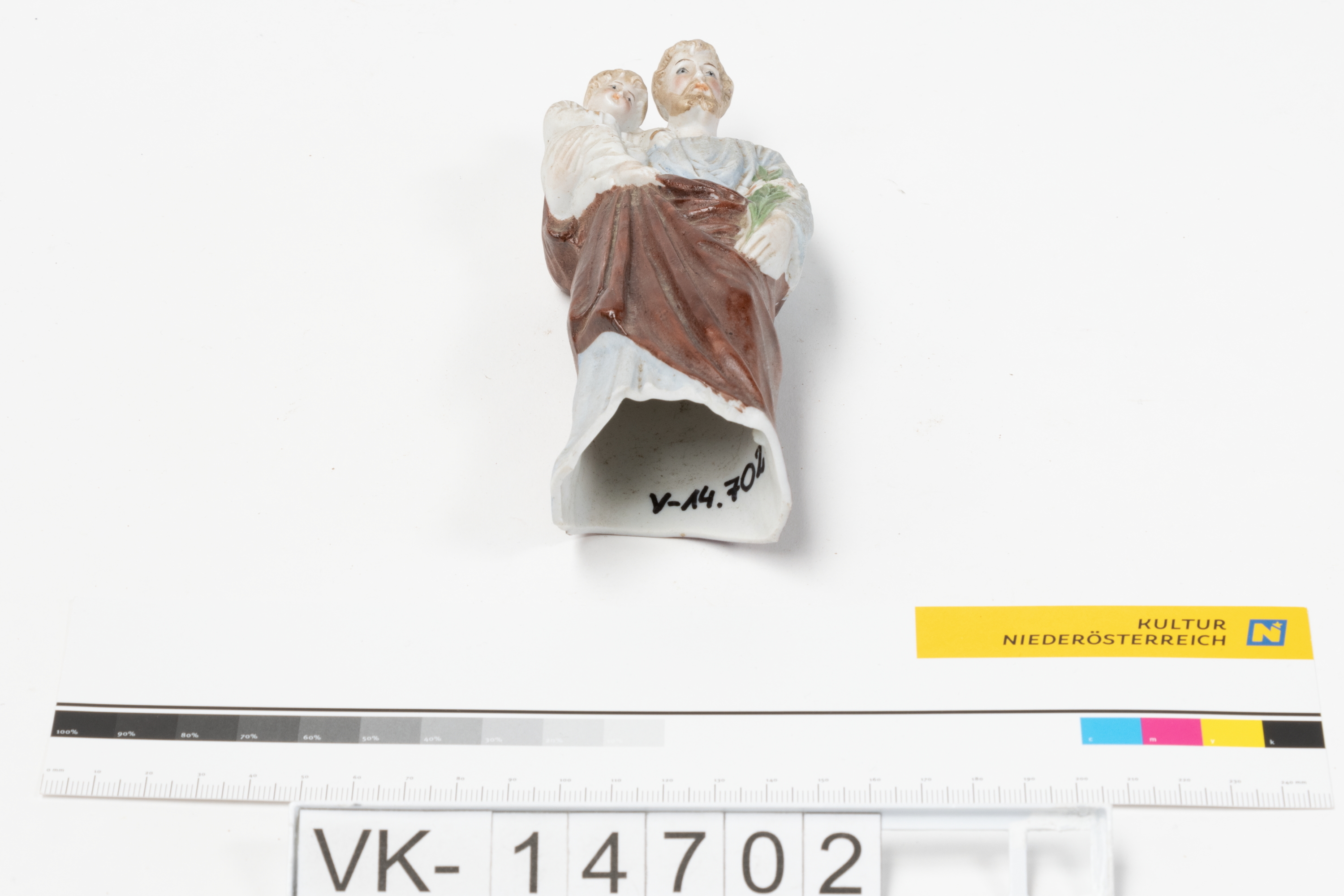 Keramikfigur mit mehrfärbiger Bemalung, innen hohl: Darstellung des Hl. Josef mit Jesuskind und weißer Lilie.
