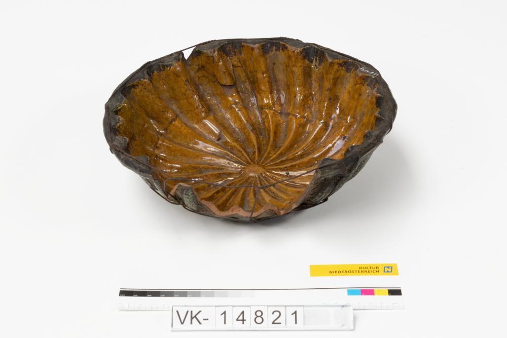 Außen dunkelgrün und innen hellbraun glasierte Backform mit radialem Wellenmuster, die Form ist außen mit einem Drahtgeflecht stabilisiert.