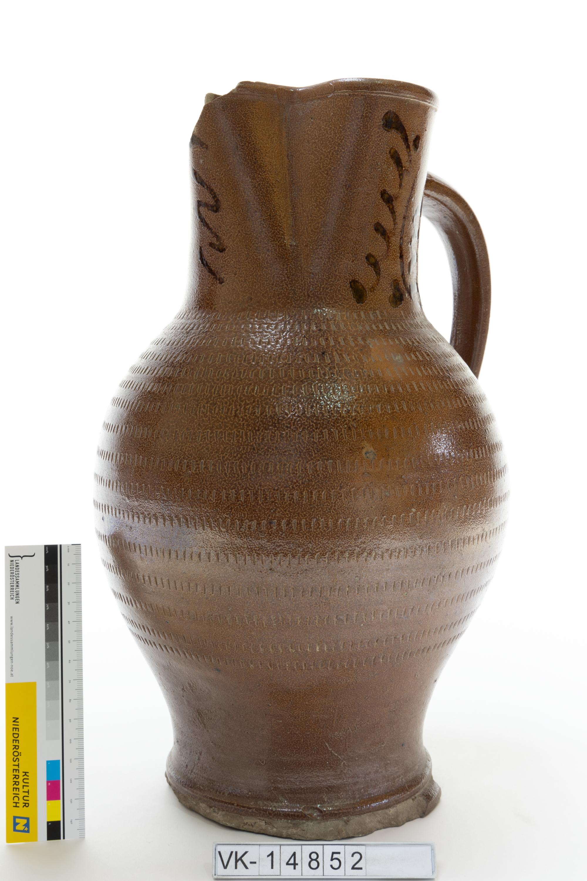 Bauchiger glasierter Krug mit unterrandständigem Wulsthenkel, großflächig mit Kerben verziert und einfachen Zierelmenten im Halsbereich.