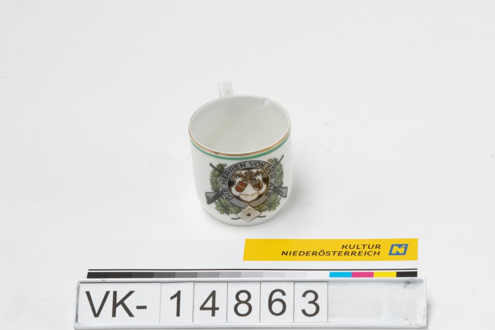 Kleine weiße Mokkatasse mit der Darstellung von gekreuzten Gewehren, Wappen, einer Zielscheibe und Eichenlaub sowie der Aufschrift: "DIE HERREN VON DER ALS HERNALS".