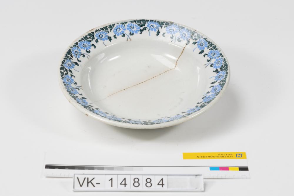 Weiß glasierter Teller mit Dekor im Randbereich (große blaue Blüten, grünes Blattmuster) und an der Unterseite einer Bohrung. Auf dem Teller befindet sich ein Aufkleber mit der Aufschrift: "Im Jahre 1916 kaufte ich als ich um Nahrungsmittel hamsterte in Zneim diesen Teller mit 11 seiner Cameraden. bis zum 31. Jänner 1928 hielt er im alltäglichem Gebrauche aus Als Jinvalide übermache ich ihn meiner Nachkommenschaft, möge die nie Kriegs- od: Wirthschaftselend kennen lernen. E. R. PERL"