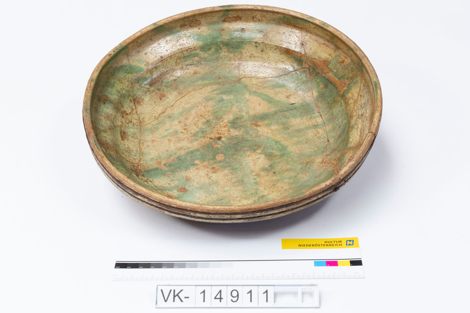 An der Innenseite grün und beige glasierte Schüssel mit zwei umlaufenden Rillen außen am Rand.