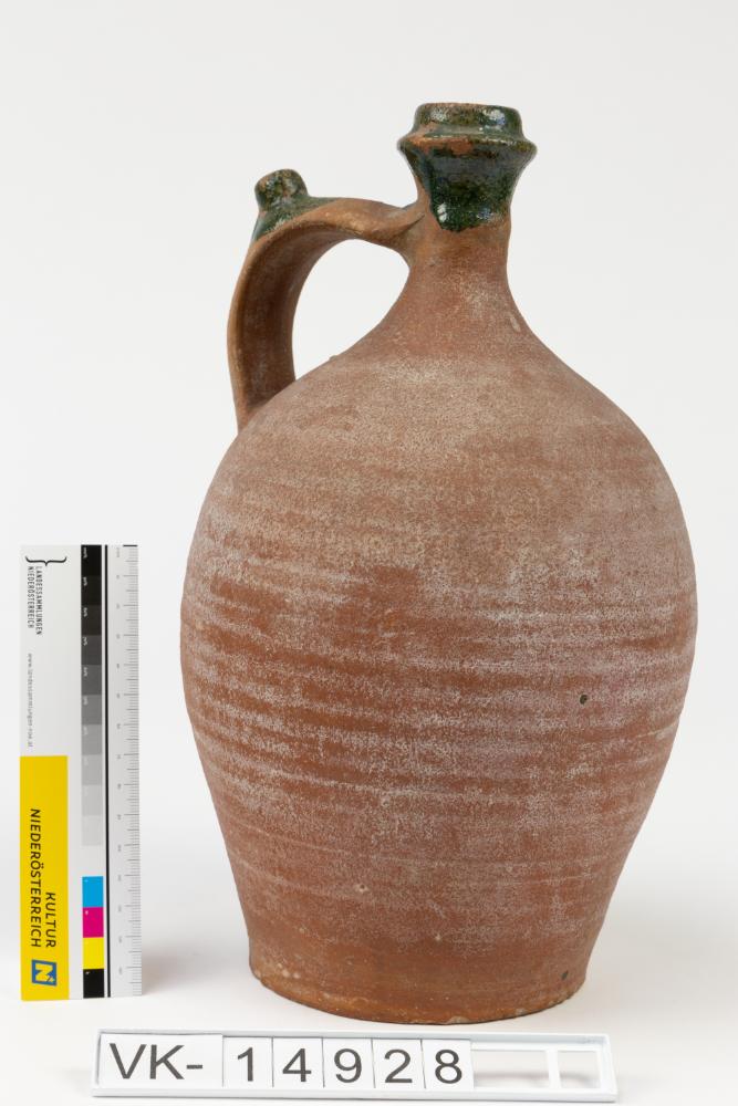 Im Hals- und Henkelbereich teilweise grün glasierter Plutzer mit halsständigem Henkel.