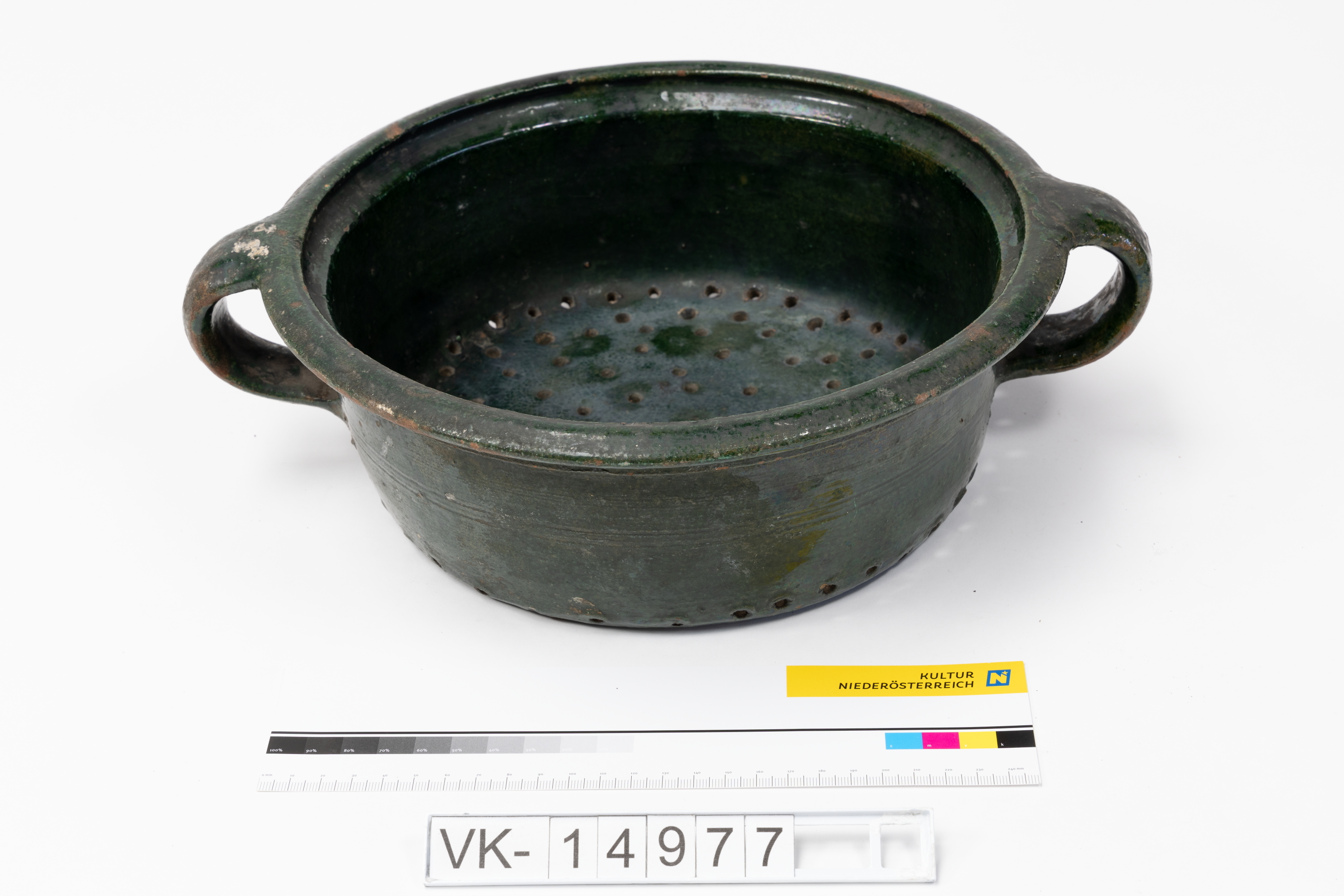 Sieb: Dunkelgrün glasierter, zylindrischer Topf mit zwei randständigen Bandhenkeln und einem gelochten Boden.