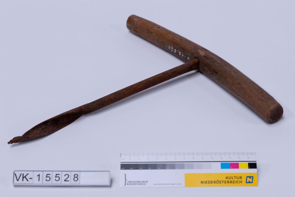 Handbohrer mit zylindrischem, leicht gebogenem Holzgriff.
