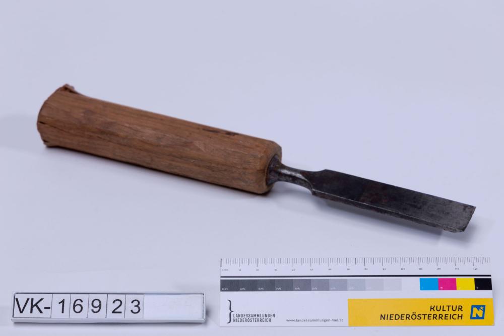 Flacher, breiter Meißel mit Verjüngung am Übergang zum Griff und einem zylindrischen Holzgriff. Auf dem Meißel befindet sich die Prägung: "24m/m FEINSTER GUSSTAHL".