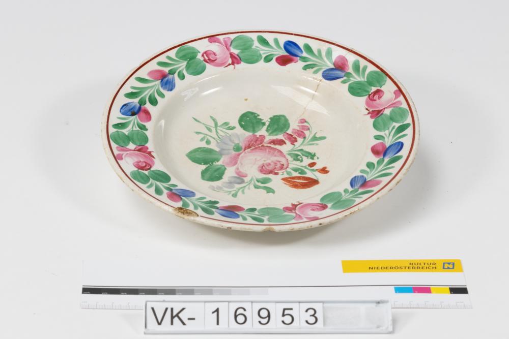 Weiß glasierter Teller mit mehrfärbigem Dekor: Rosa Blüten auf Boden und Rand, umlaufendes Blattmuster.
