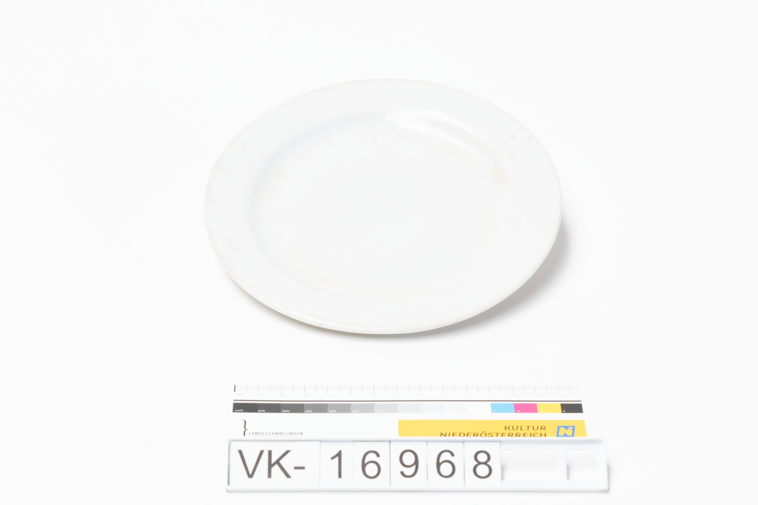 Weiß glasierter kleiner Teller. Auf der Unterseite befindet sich die Herstellermarke: "LILIENPORZELLAN AUSTRIA 77".