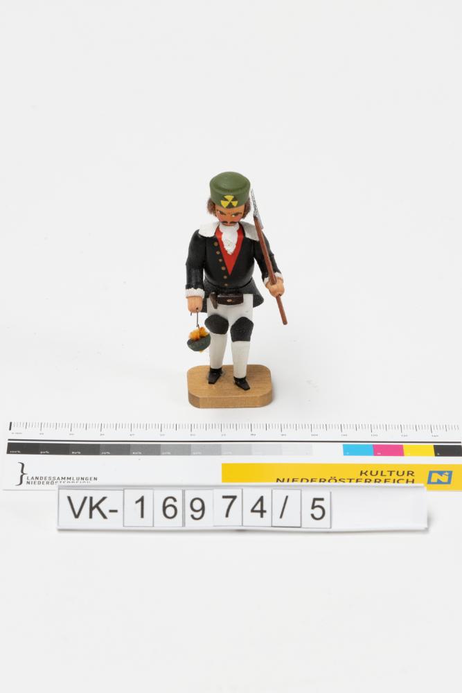 Kleine Holzfigur: Mann mit schwarz-weißer Uniform, dunkelgrüner Kappeund Hacke über der Schulter. Auf dem Sockel befindet sich unten ein Aufkleber: Darstellung eines Wappens (Marke) mit "WW" und der Aufschrift: "3 Häuer um 1719 entw. 1982".
