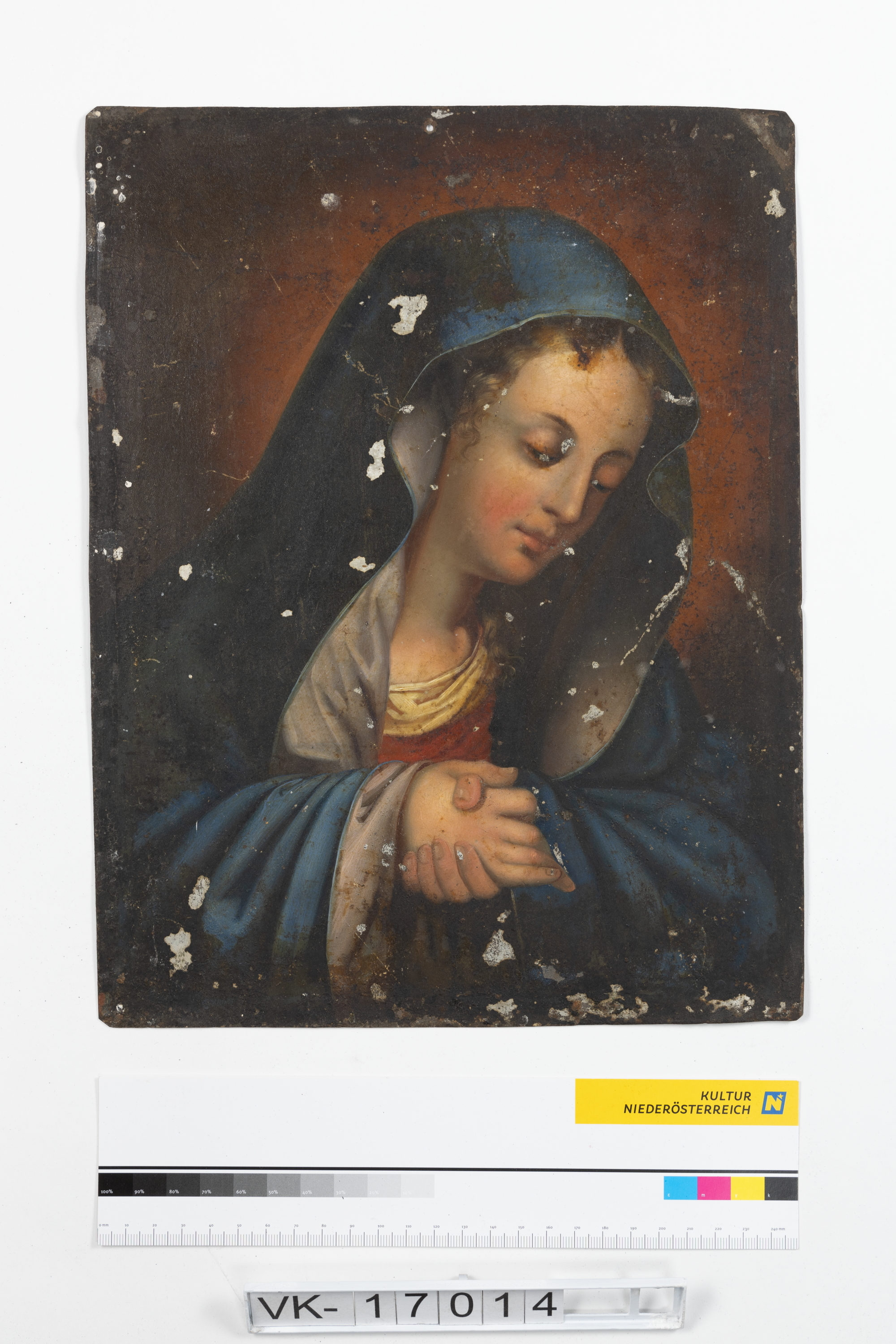 Mehrfärbige Malerei auf einer Blechplatte: Mariendarstellung.
