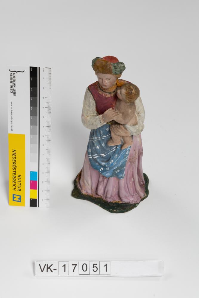 Bemalte Krippenfigur aus Gips auf einer Holzplatte: Stehende Frau mit Kind auf dem Arm, einem rosa Kleid und einer blauen Schürze.