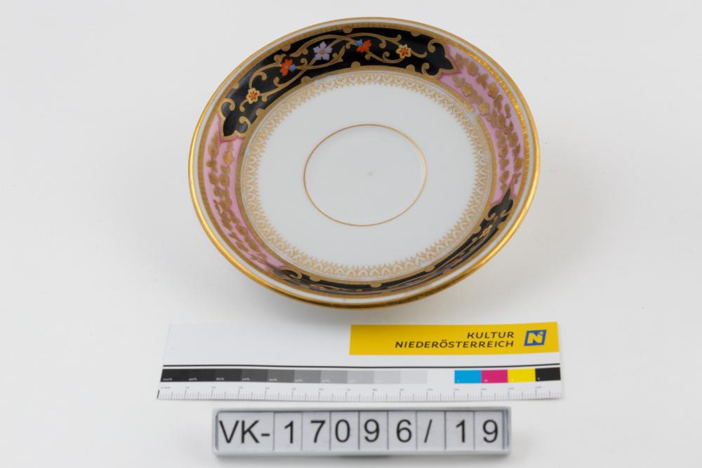 Untertasse mit Dekor: Goldlinien, vergoldeter Rand und ein umlaufendes Dekorband (je zwei schwarz und rosa hinterlegte Elemente, die mit goldenen Ranken und mehrfärbigen Blütendarstellungen verziert sind) an der Wandung.