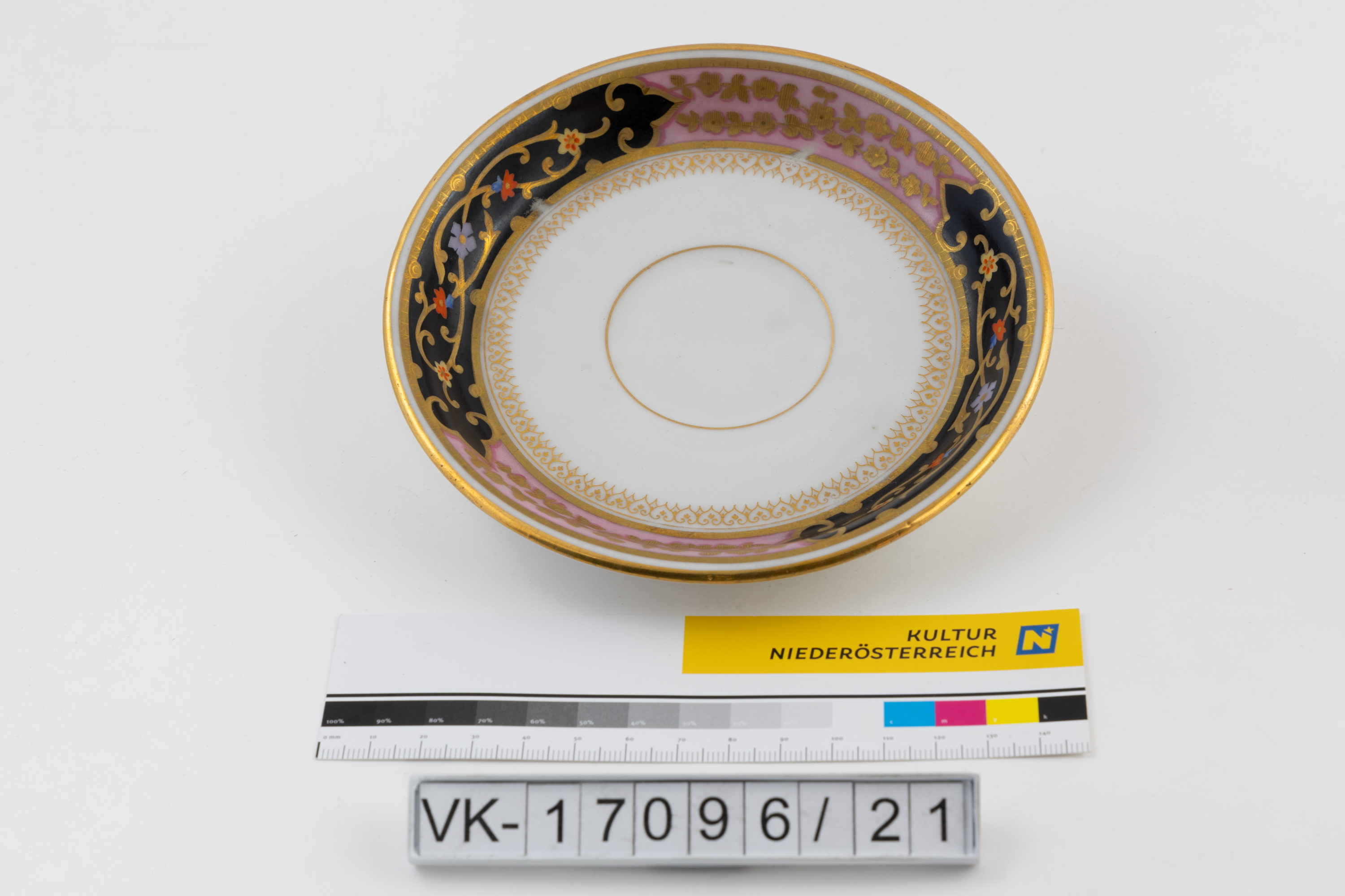 Untertasse mit Dekor: Goldlinien, vergoldeter Rand und ein umlaufendes Dekorband (je zwei schwarz und rosa hinterlegte Elemente, die mit goldenen Ranken und mehrfärbigen Blütendarstellungen verziert sind) an der Wandung.