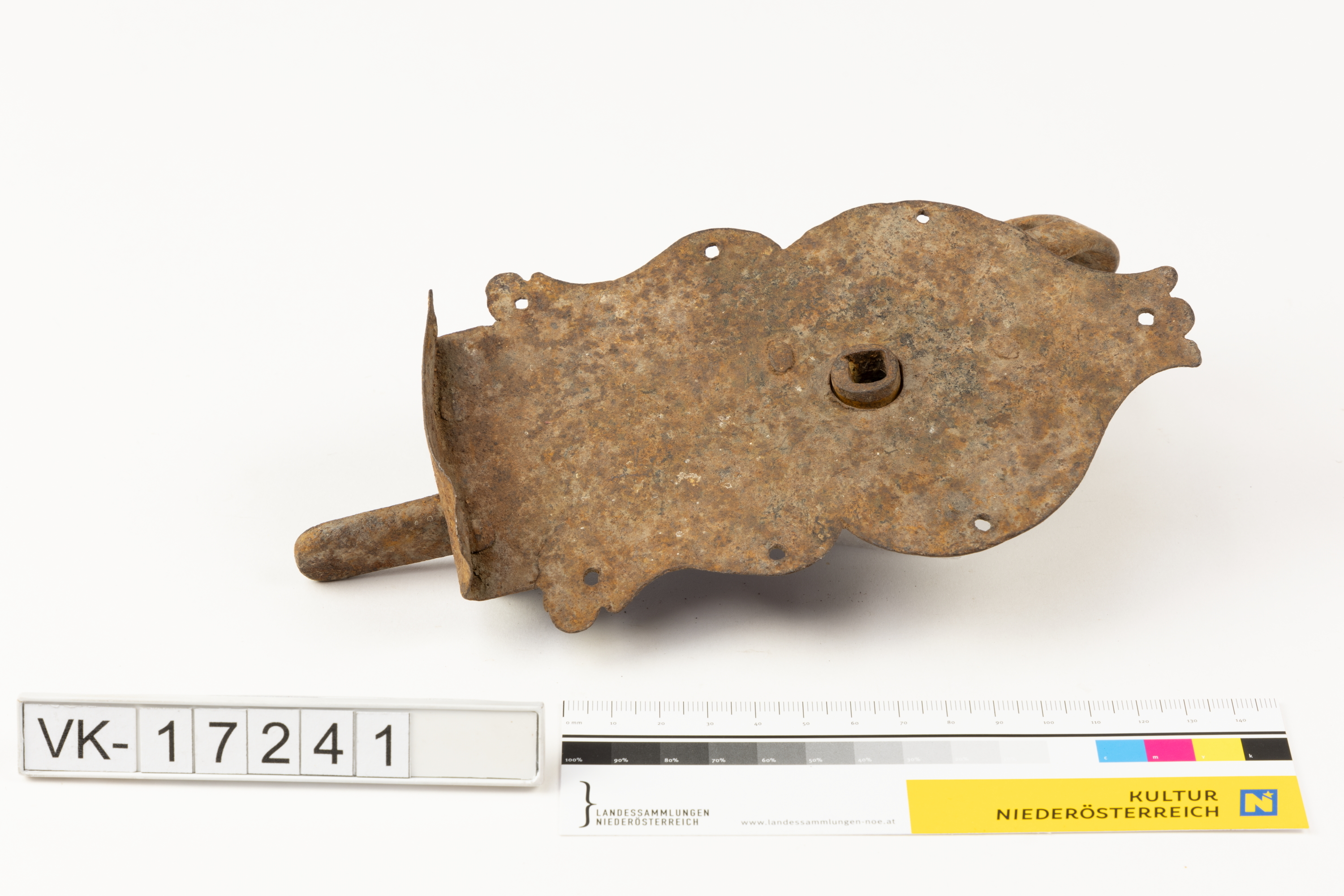 Schmiedeeisernes, teilweise offenes Türschloss auf einer auf einer Seite geschwungen auslaufenden Platte mit verzierter Schnalle, Vierkantaufnahme und Hebefalle.