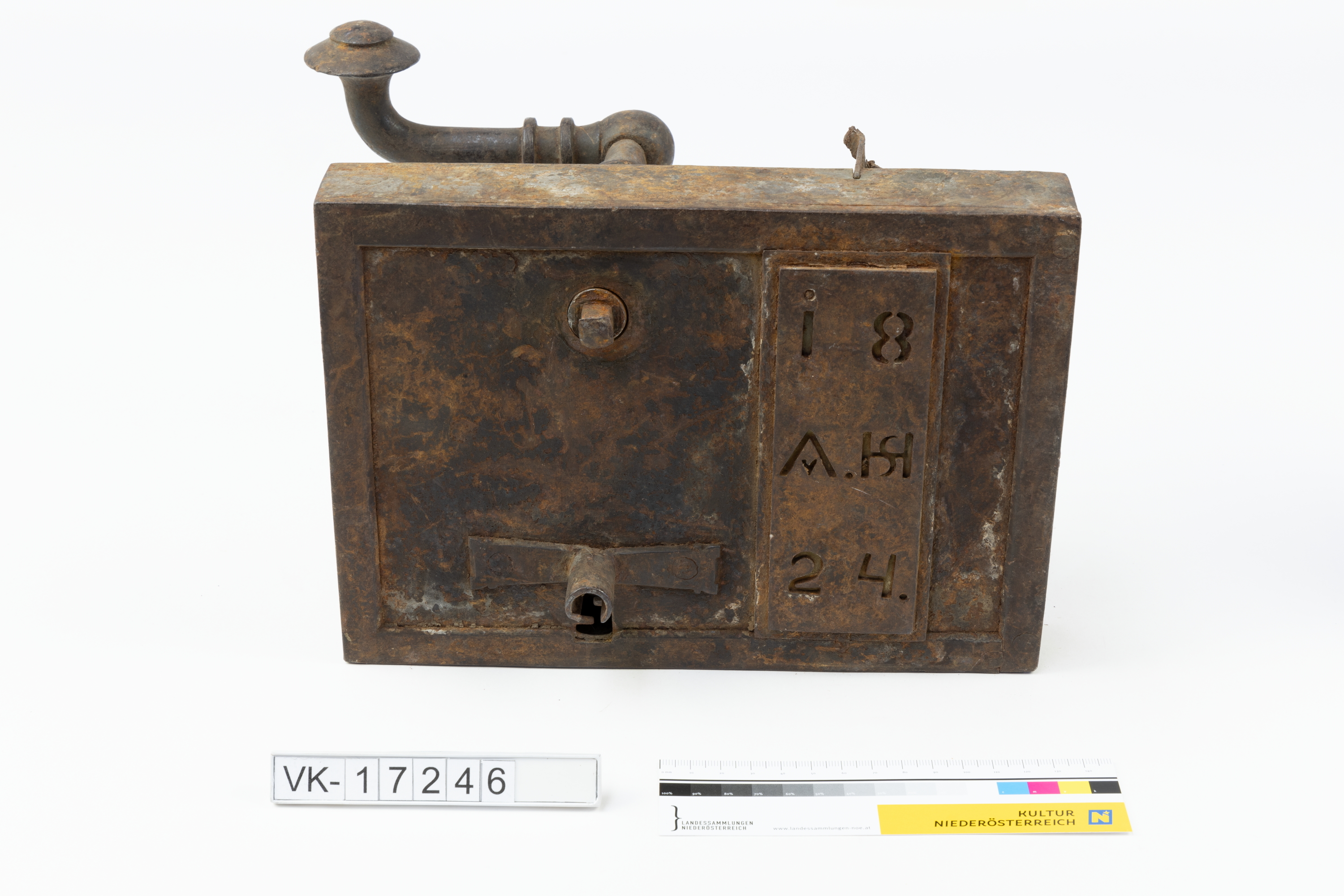 Großes, schmiedeeisernes, einseitig offenes Türschloss mit einem Schlüsselloch und einer Schnalle. Auf einer Seite ist eine durchbrochene Plakette angebracht: "1824 AH". Das Schloss hat einen Riegel und eine Hebefalle.