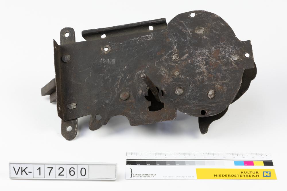 Schmiedeeisernes, offenes Türschloss mit zwei Riegeln, einem Schlüsselloch und mit Ziselierung verzierten Abdeckplatten.