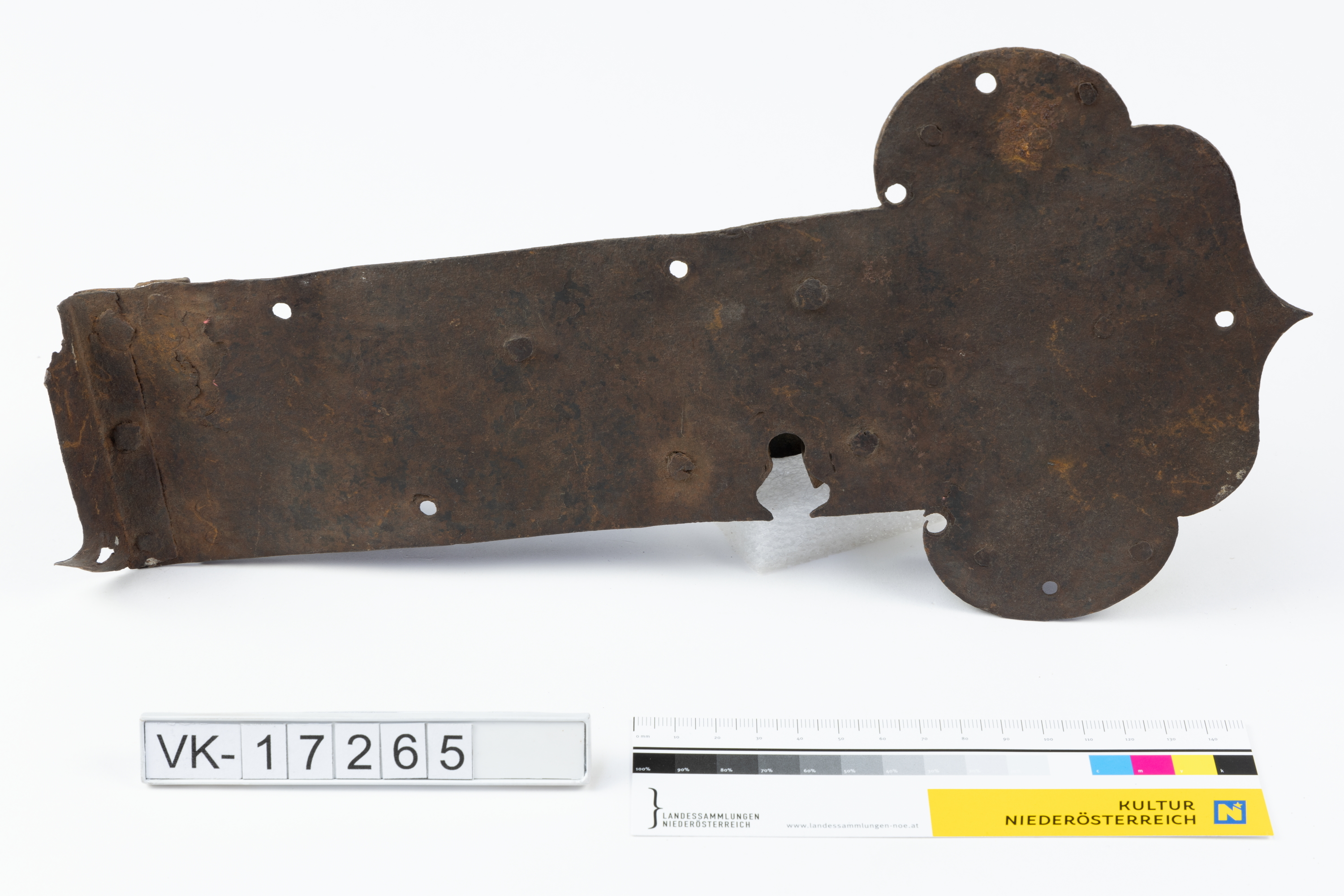 Schmiedeeisernes, offenes Türschloss auf einer annähernd dreipassförmig abschließenden Platte mit einem Schlüsselloch und einem Riegel. Die fünf Niete sind mit einem radial geprägten Zierelement versehen.