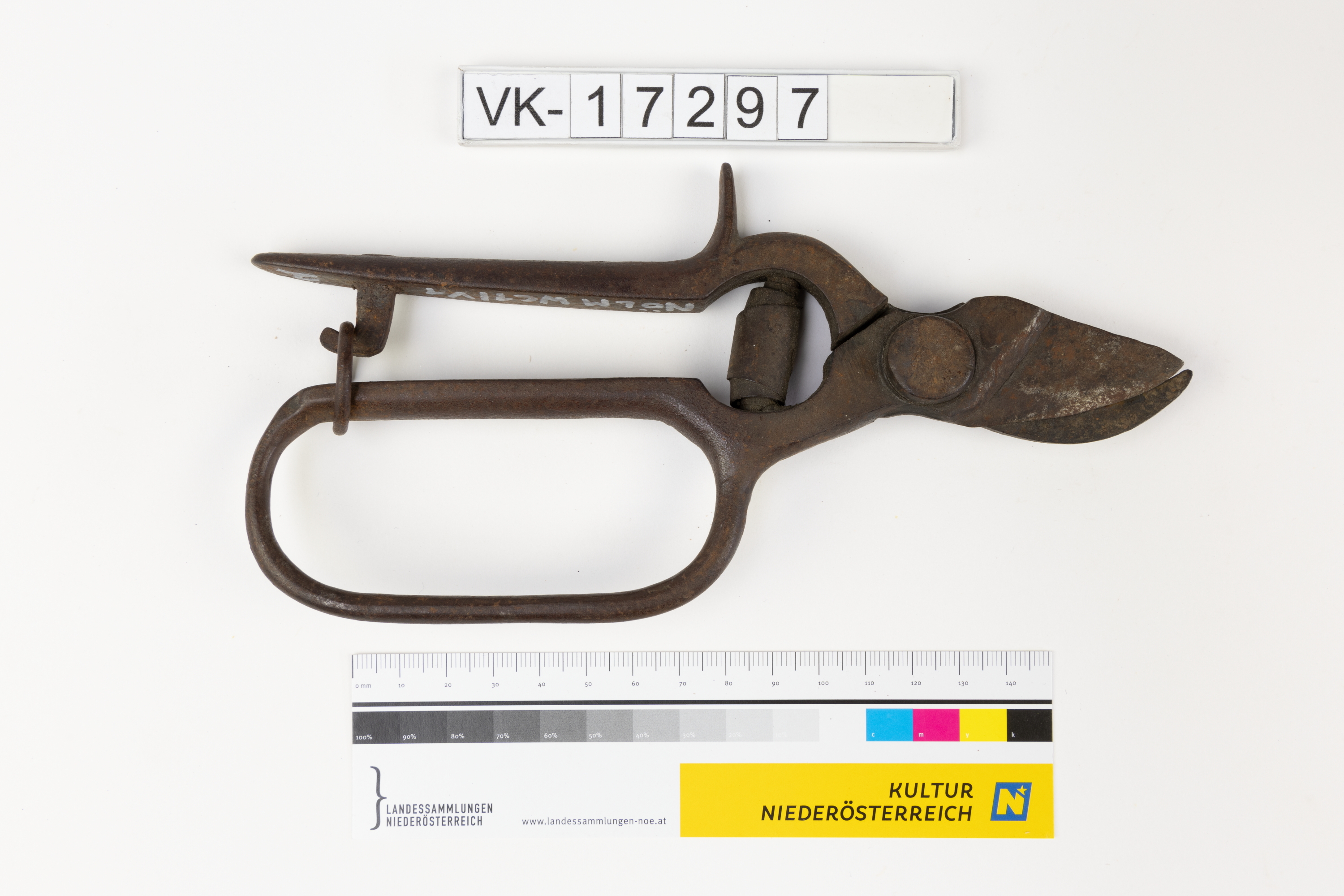 Gartenschere mit zwei Griffen, von denen einer zu einem ovalen Auge geformt ist, mit einer breiten und einer schmalen Klinge, einer Feder und einem Verschlusshaken.