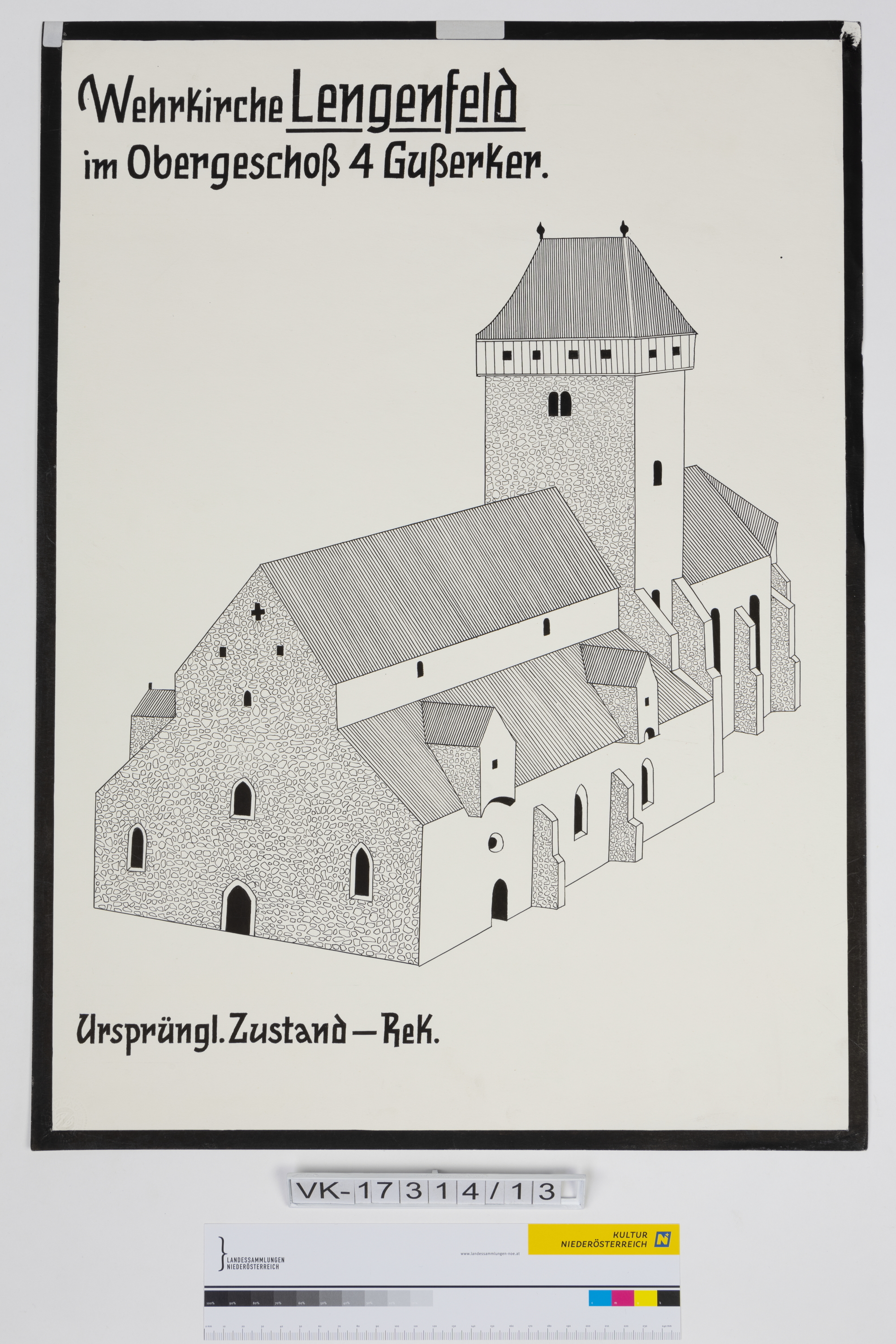 Schautafel mit Zeichnung und Text: Wehrkirche Lengenfeld - ursprünglicher Zustand.