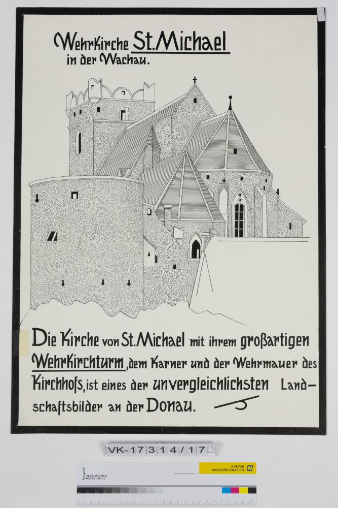 Schautafel mit Zeichnung und Text: Wehrkirche St. Michael in der Wachau.