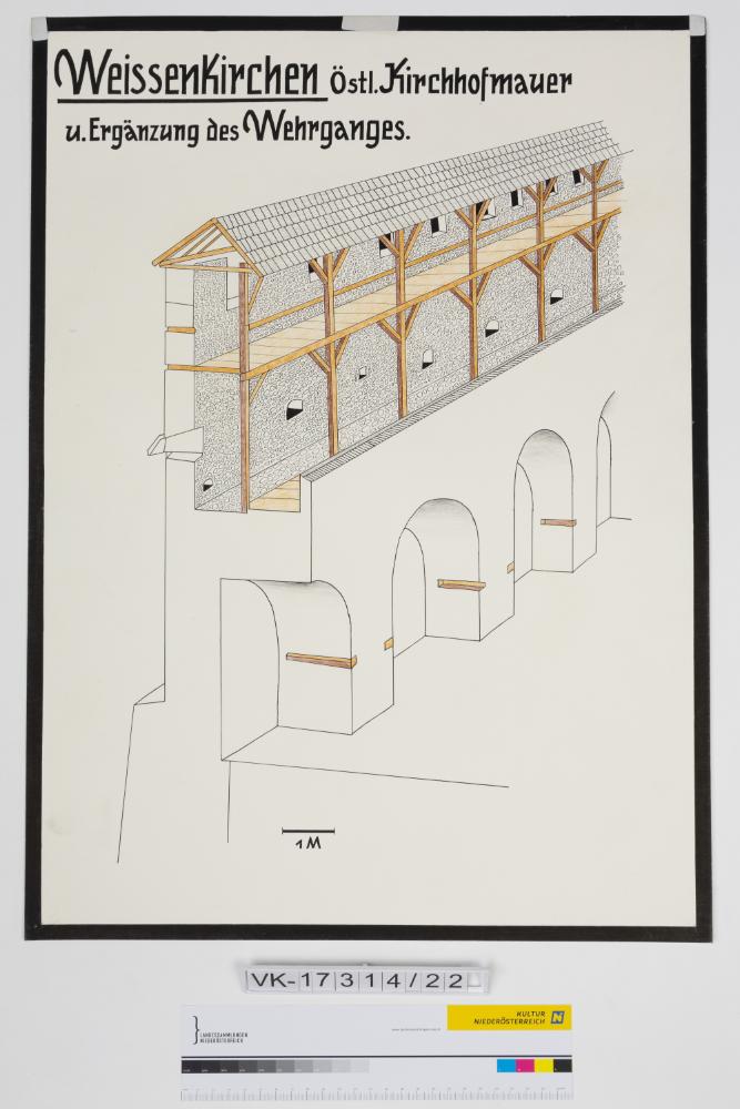 Schautafel mit Zeichnung und Text: Wehrgang in Weissenkirchen.