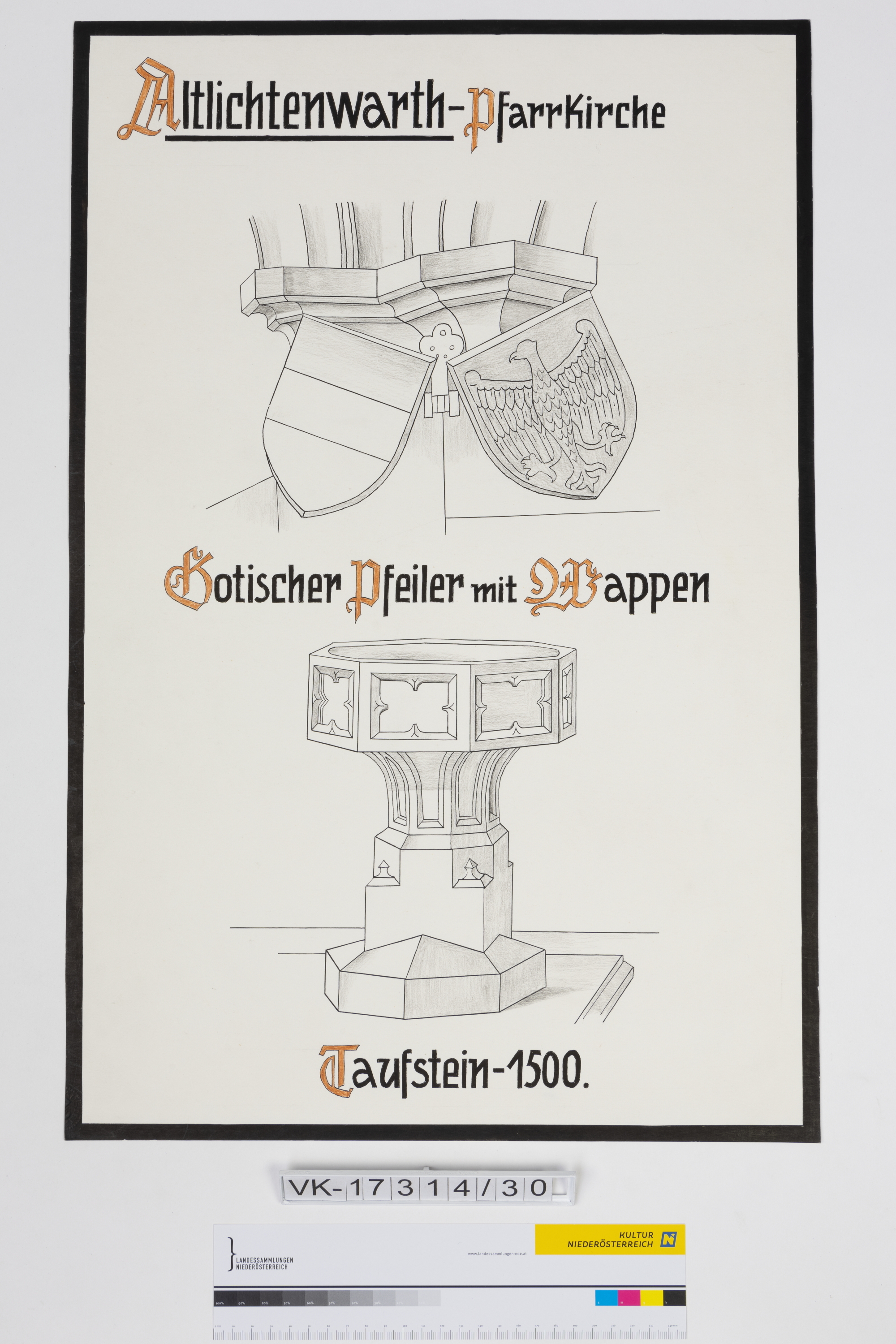 Schautafel mit Zeichnung und Text: Wappen und Taufstein in der Pfarrkirche Altlichtenwarth.