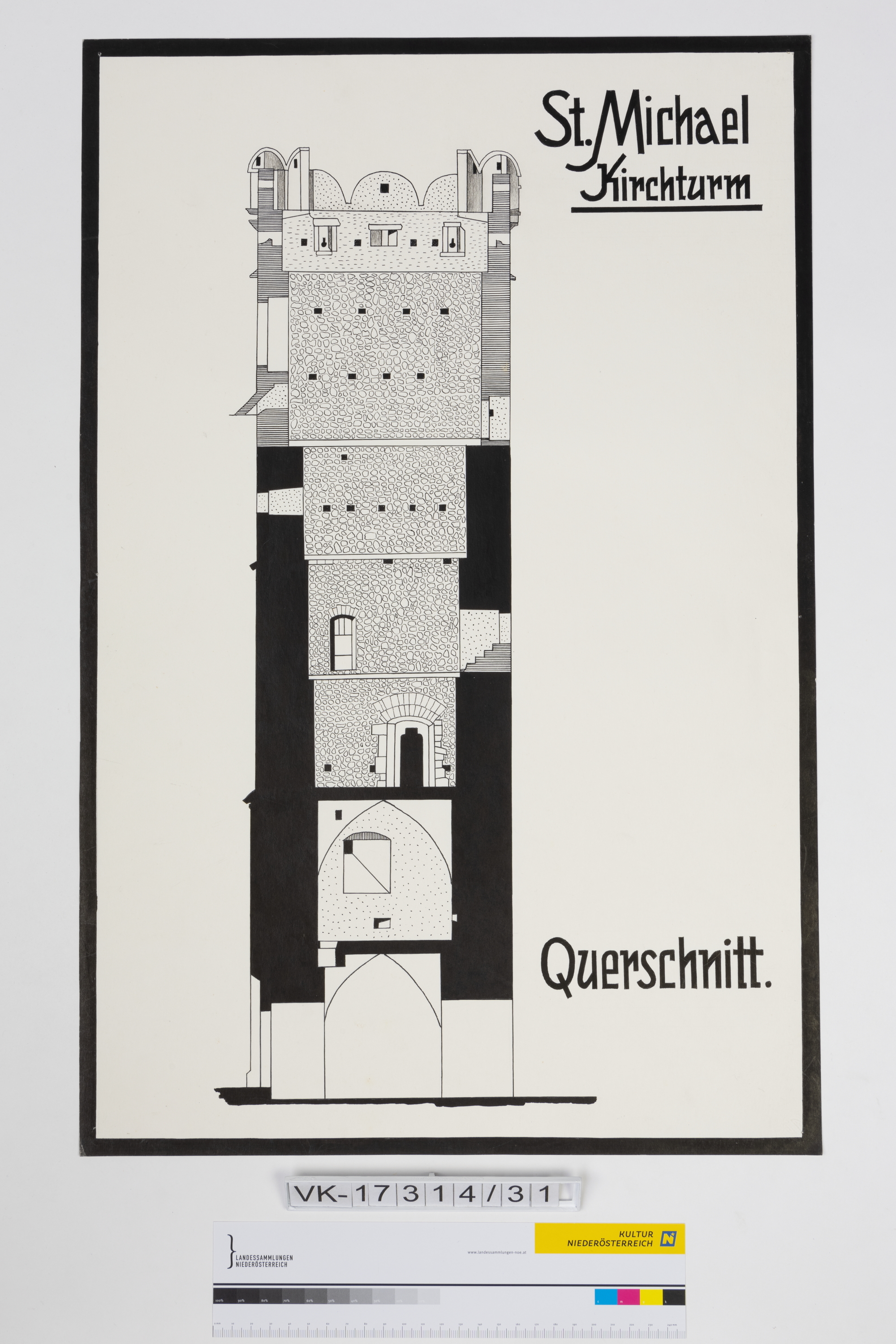 Schautafel mit Zeichnung und Text: Kirchturm St. Michael.