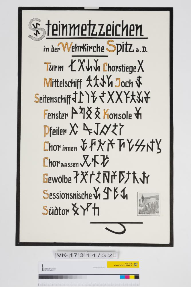 Schautafel mit Text und einem kleinen Druck zum Thema Steinmetzzeichen in der Wehrkirche Spitz.