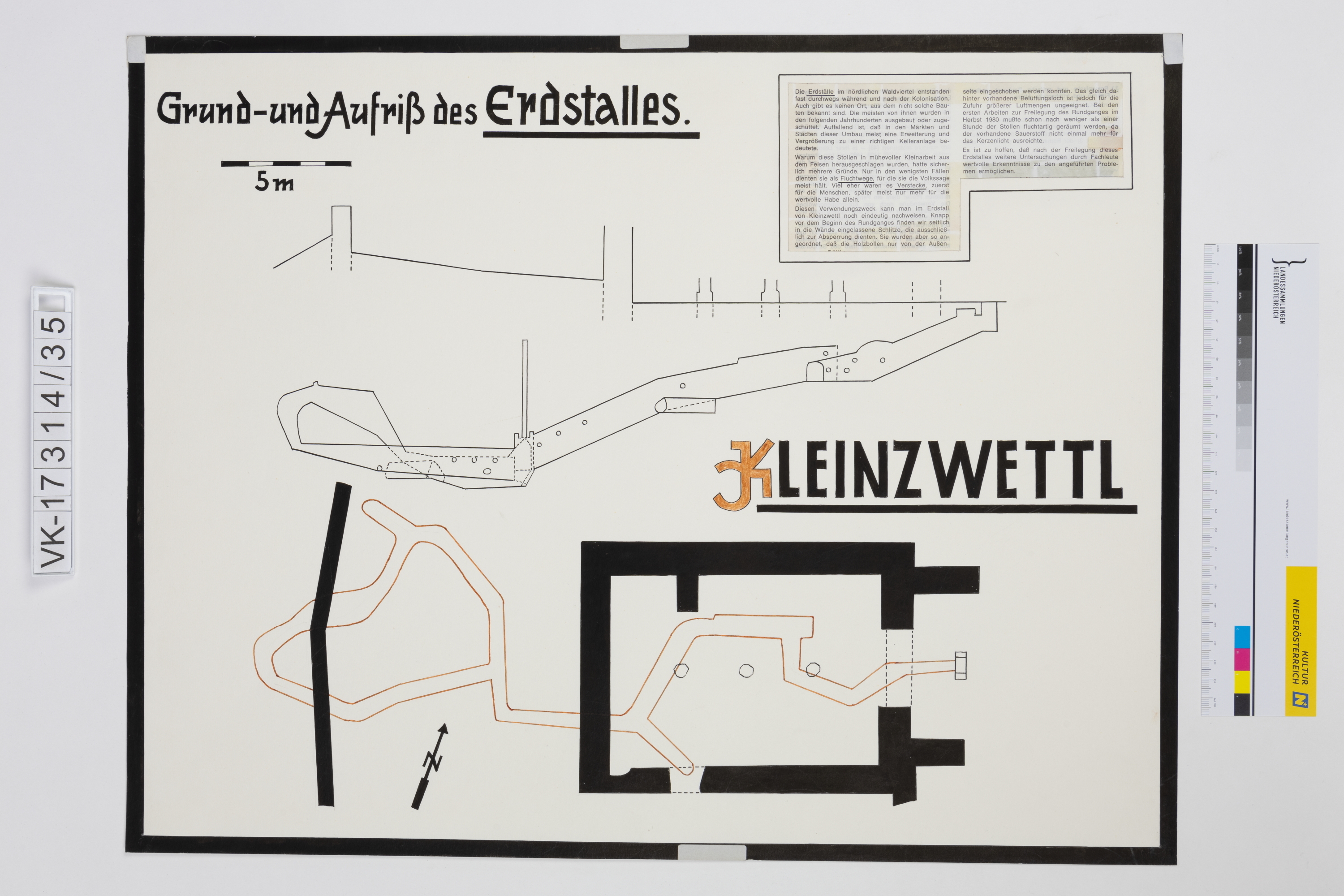 Schautafel mit Zeichnung, Beschriftung und einem kleinen gedruckten Text: Erdstall in Kleinzwettl.