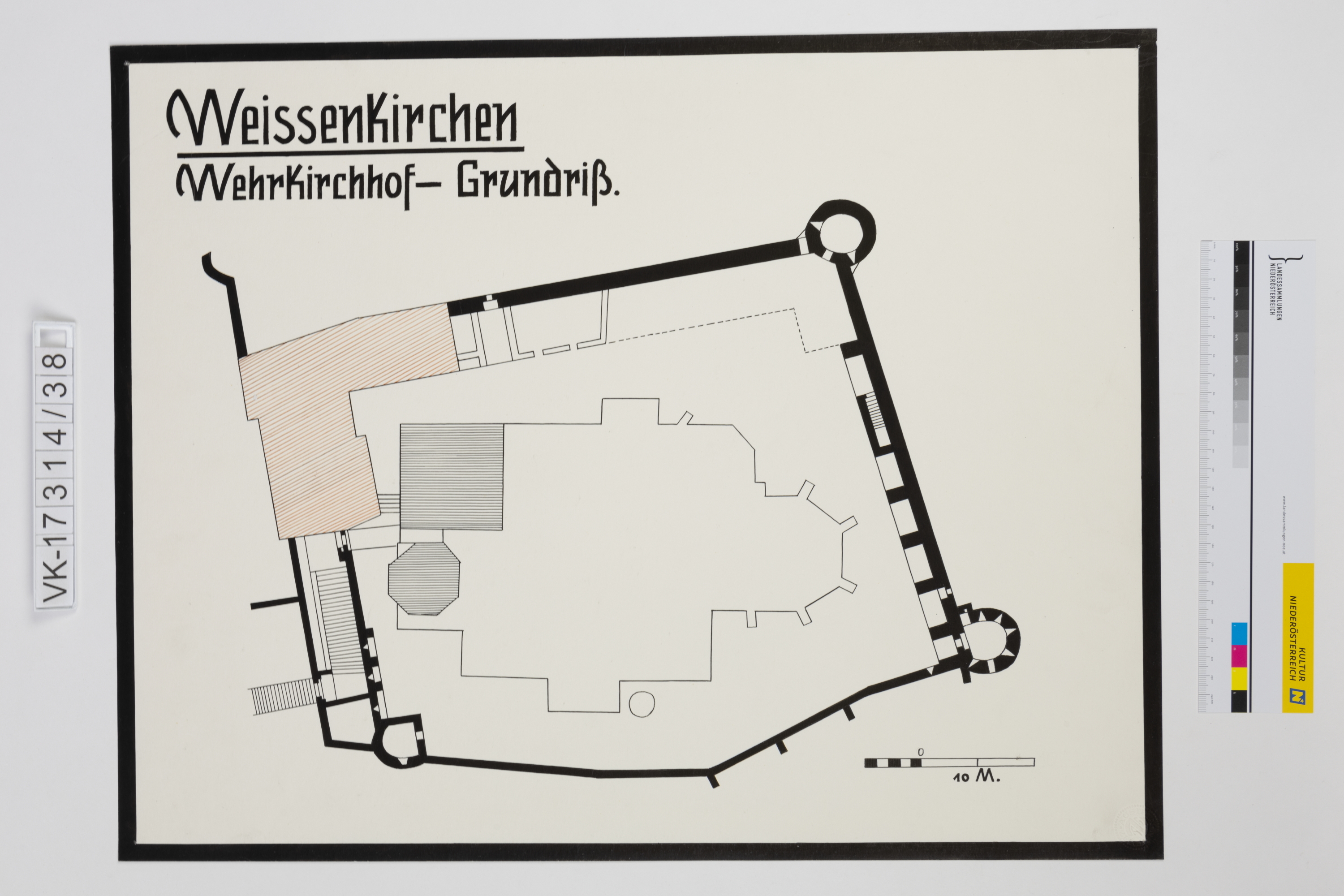 Schautafel mit Zeichnung und Text: Wehrkirchhof Weissenkirchen.